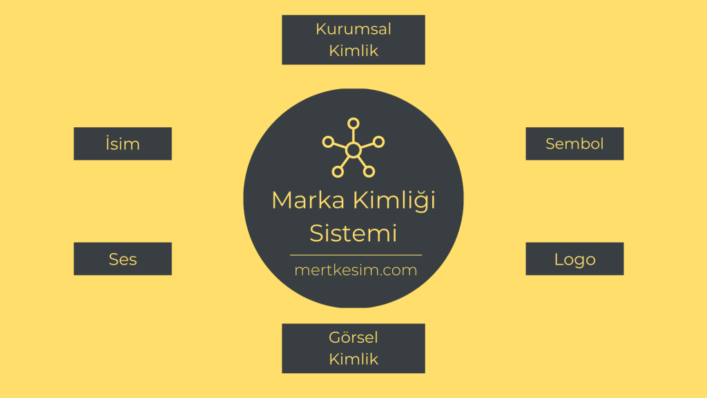 X eksenine markanın kimliğini yerleştirebiliriz. Marka kimliği tahmin edebileceğiniz üzere markanın kim olduğunu bize belirtir. Bu kimliği isim, logo, sembol, kurumsal kimlik, görsel kimlik ve ses olarak 6 parça ile sistemleştirebiliriz.